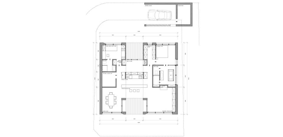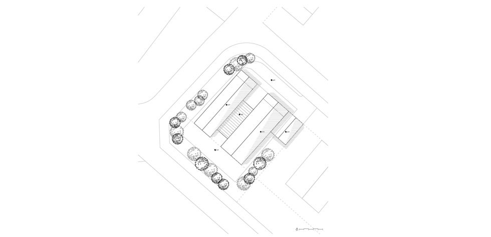 We were asked to design a simple house for a family consisting of only two members: a single mother and a daughter with disabilities. While the teenager is seeking for a bit more privacy and independency, the mother needs to be close enough in case of an emergency. Following universal design requirements, the residence is completely wheelchair accessible. We were interested in the typology of the traditional double house, which is the symmetrical arrangement of two houses sharing one wall. A double house offers two separate zones, but instead of sharing a central wall, mother and daughter share a common kitchen area. Entrance, loggia and terrace separate the two volumes, whilst the middle service zone with flat roof and double corridor connects them as one.