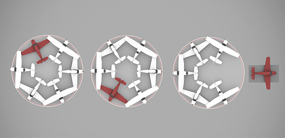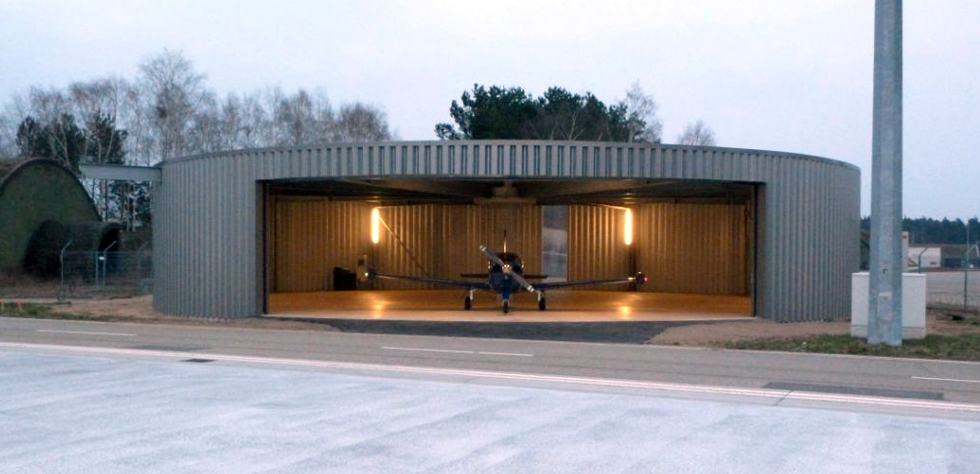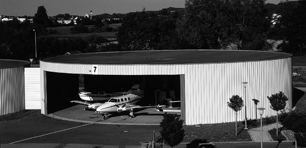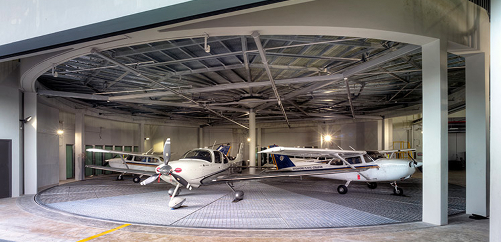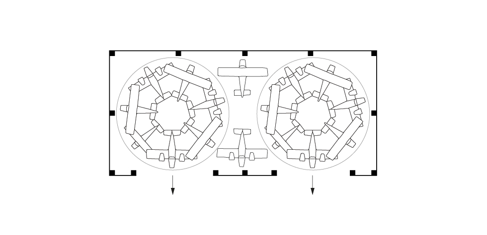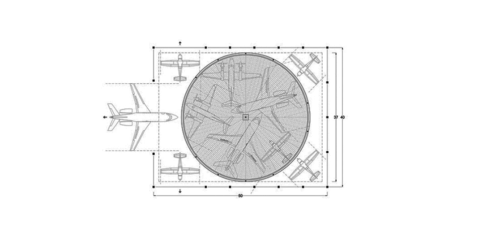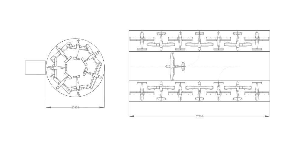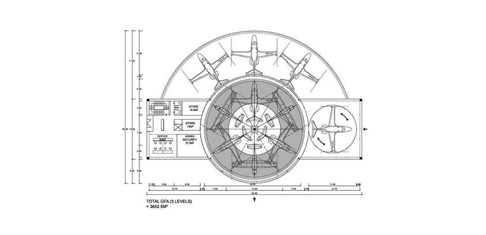 The innovative solution for a maximized usage of land on an airport enables to increase the hangar operations on a smaller footprint. But it leads to a structural design challenge to build the most ecological, economical and feasible facility. A rotating turntable system is stacked vertically and holds the vertical loads of 54 tons. The two-stories of independent rotating discs hold up to 14 aircraft.