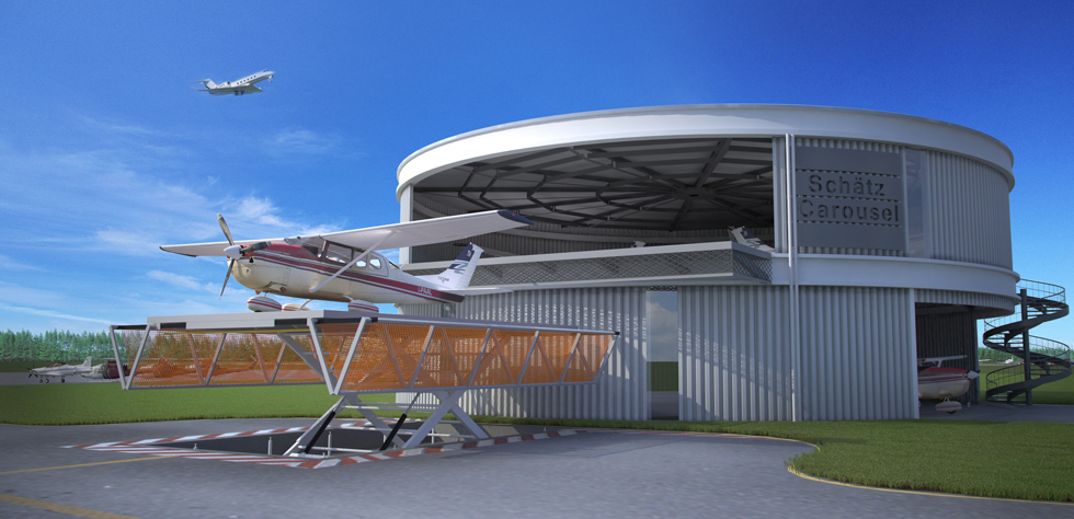 Schätz Aircraft Carousel, a design developed and patented in Germany, provides easy parking, relocating and safer handling for private aircraft, business or military jets, cars and logistical goods. The system has been implemented in more than 150 times on more than 50 airports in Germany, Austria, Switzerland, Italy and Singapore.