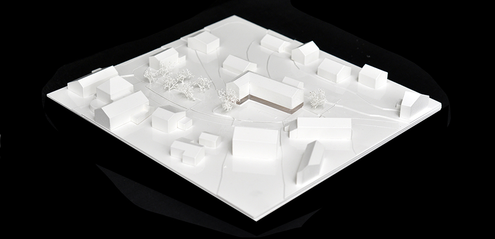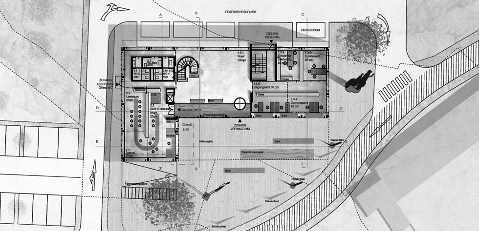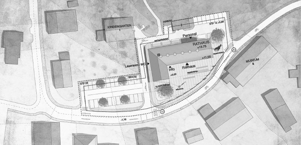 A L-Shaped Town Hall carefully positioned, creates a public space which is bounded by the old trading road and the roman museum. Offices, meeting rooms and wedding rooms offer magnificent views across the lake towards the alps, while the mayor's office and the tourist information are located representatively towards the village. The entrance hall offers a gallery space, cafe and community centre.