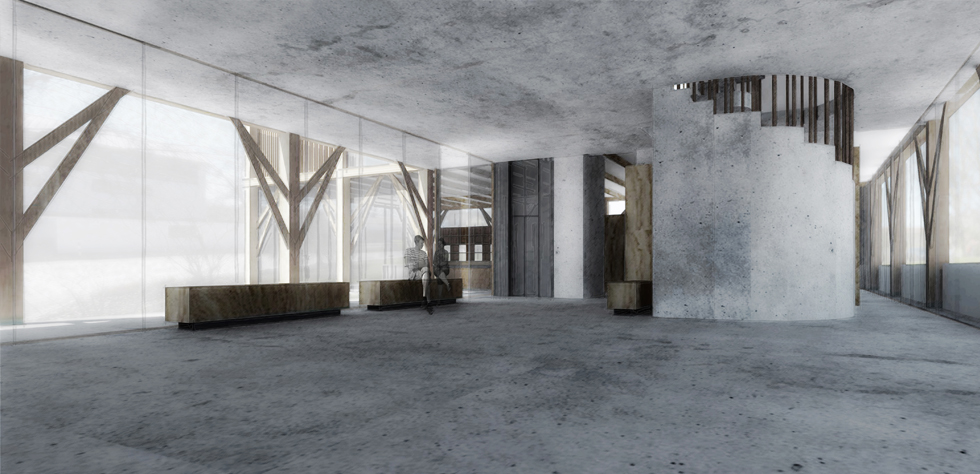 The town hall is a low energy timber framework construction with structural concrete cores as heat storage. The cooling system is drawn from the nearby lake. The building celebrates with larch wood cladding, cross timber joints and imprinted timber blades, the traditional art of carpentry in the region. Rotating wooden louvers serve as sunscreen to the large opening in the south and west.