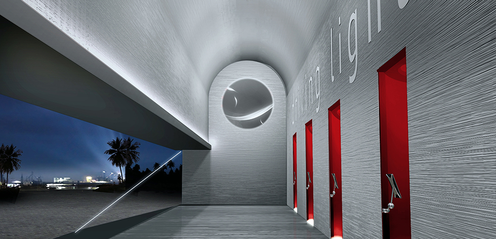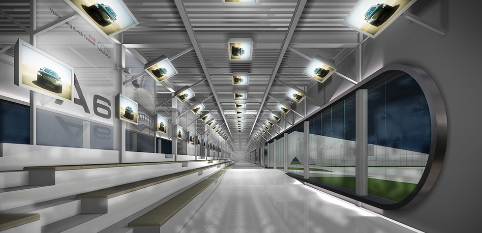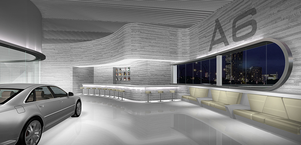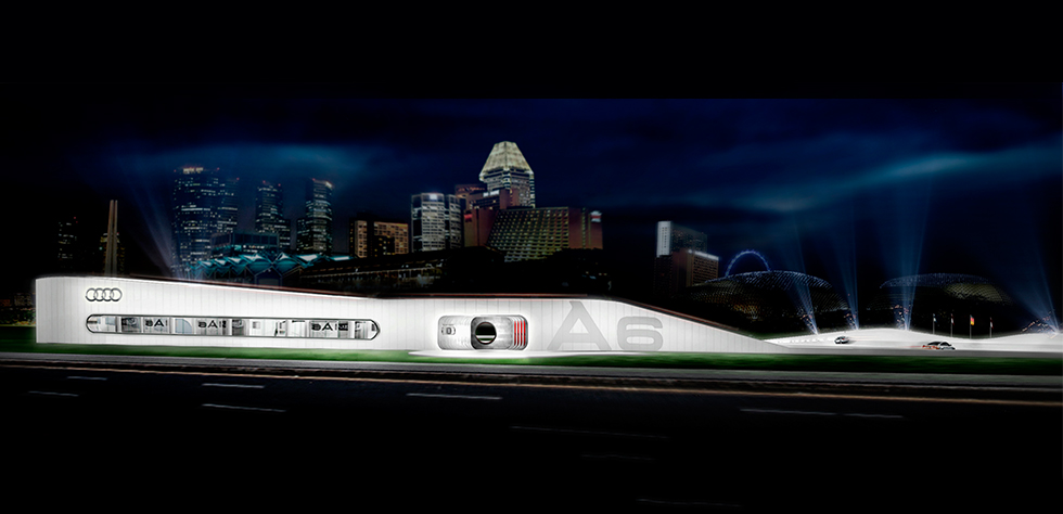 The Lingotto Factory Roof race track was built avant-garde and is up till today highly influential and impressive. For the launch of the new A6 in Singapore, we took that as an inspiration and let a racetrack become the building. The Audi A6 Arena is in the centre of the Padang, surrounded by several important landmarks. An extraordinary driving experience defines a spectacular form, on the size of football field. With two steep ramps, two steep turns and a central performance platform, the building effectively translates Audi’s idea of driving experience and uses the idea of lightweight within the building structure. The end result is a sophisticated showroom, exhibition gallery, event stage and bar, which is setting new marketing standards for the launch of the sporty business saloon. Functional, comfortable and target group orientated, the showroom is a premium in all aspect and guarantees the most action during the performance.