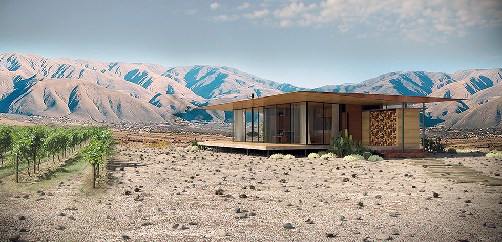 The house is situated next to a river in the Colalao Del Valle amidst beautiful vineyards allowing for optimal sun orientation. The design draws on the classical case study houses to produce a low cost yet comfortable home. A structural block of kitchen, bathroom, and storage spaces holds up the roof and divides the space into bed and living-room. Inside, a small and efficient woodstove heats the cabin during the cold winter days.